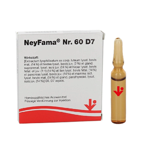 NeyFama No.60 Ampollas D7- “Cuerpo lúteo, testículos, glándula. supraren., Hepar, Lien, Pancreas, Mamma lact., glan parathyreoidea,. Timo, Cor, Ren”.